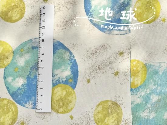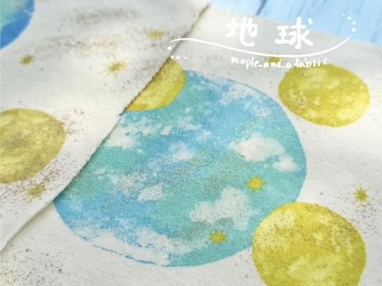 沢山の惑星の中に地球が光り輝いている柄を描きました